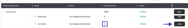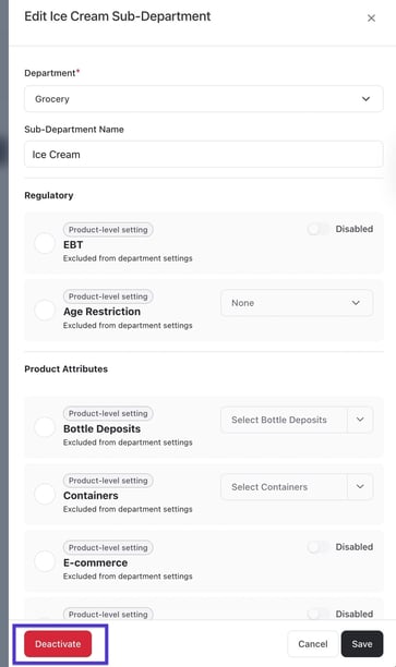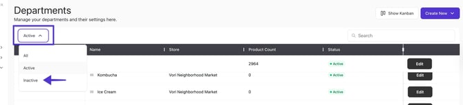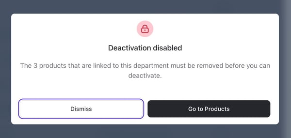 ✏️ Note: You cannot deactivate a department with products in it. You will need to remove all products from the department before you can deactivate it.