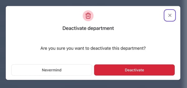 - A message will pop up asking if you are sure you want to deactivate the department. Click the Deactivate button to finish deactivating the department.