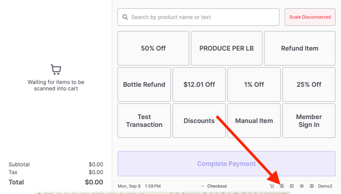 On the main cashier screen, tap the gear icon in the bottom right corner.