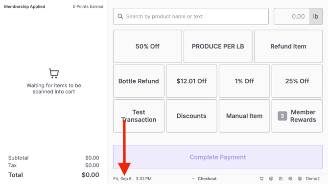 On the main cashier screen, locate the Date & Time display at the bottom.