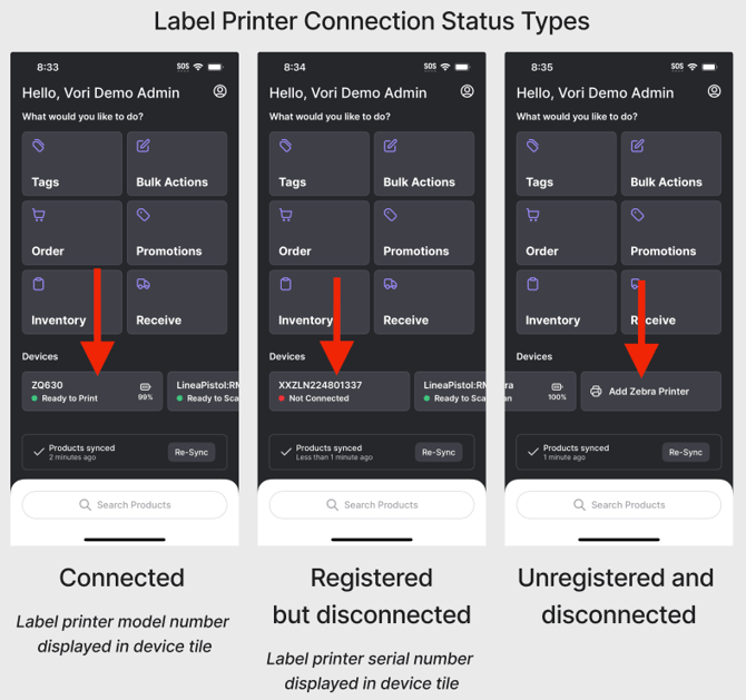 Si la impresora Zebra no se reconecta automáticamente, seleccione la impresora Zebra en la fila de Dispositivos VoriOS y siga las instrucciones de configuración en la aplicación.