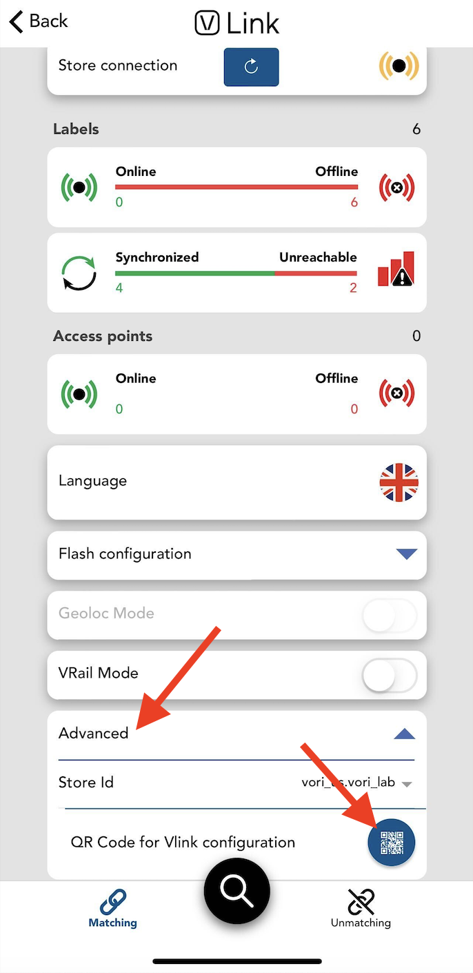 Select Advanced at the bottom of the screen to open a dropdown menu, then select QR Code for Vlink configuration.