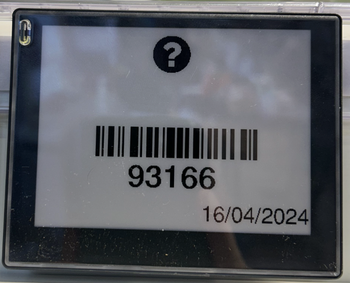 Item not on file - If the ESL is displaying a question mark, then he product being linked to the ESL is not listed in the store’s product file. Confirm that product is on-file in dash.vori.com, and possibly try manually entering the product code in Vusion Link.