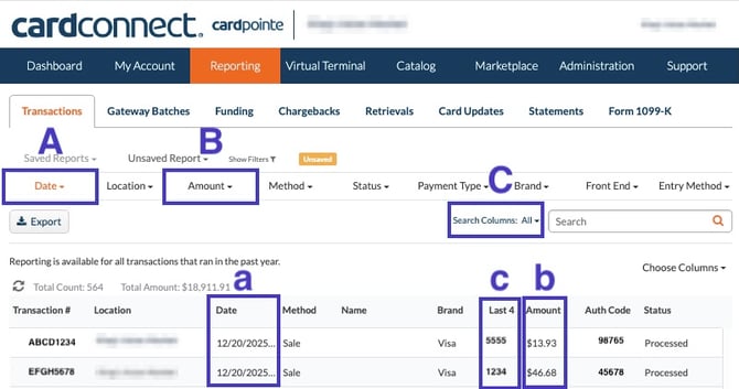 - Last 4: Click into the Search Columns button and select the Last 4 filter to filter down transactions by the last 4 digits of the card.