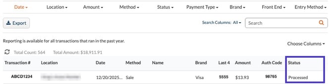 - Once the transaction is located, confirm whether it was charged by checking the Status of the transaction on the far right of the row.