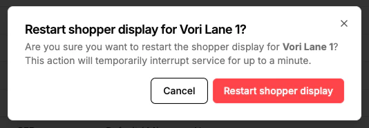 You can still restart the Shopper Display remotely using the Lanes tool in the New Back Office. ✏️ Note: The Lanes Tool is a feature in the New Back Office (app.vori.com). For instructions on accessing it, view our guide: Access the New Back Office.Accessing the Lanes Tool