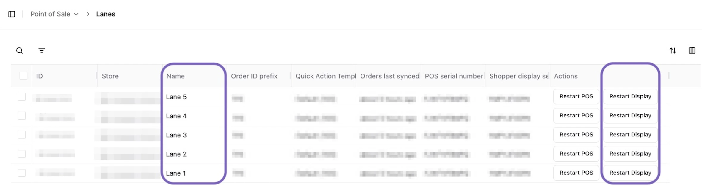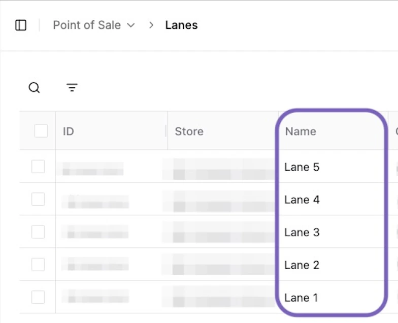 In the Lanes tool, find the lane number of the affected POS in the Name column