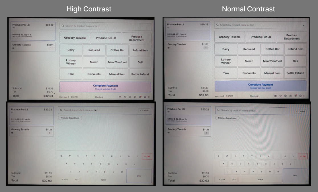 The cashier screen on the POS is designed to be easy to read in a variety of lighting conditions. Two key settings that affect screen visibility are brightness and contrast.- Brightness controls how much light the screen emits, which can help make the display easier to see in bright environments or more comfortable to view in dim settings.