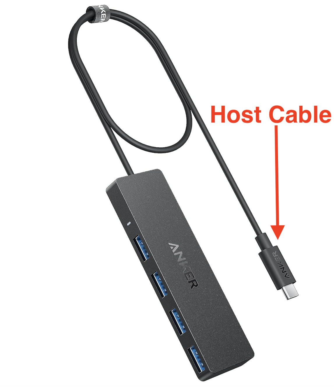 The host cable is the main cable that connects all other peripherals to the Mac Mini. It is the only cable that is permanently attached to the USB hub.