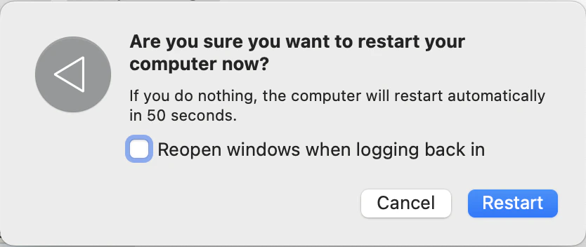 - IMPORTANT: The Reopen windows when logging back in toggle should be left blank.