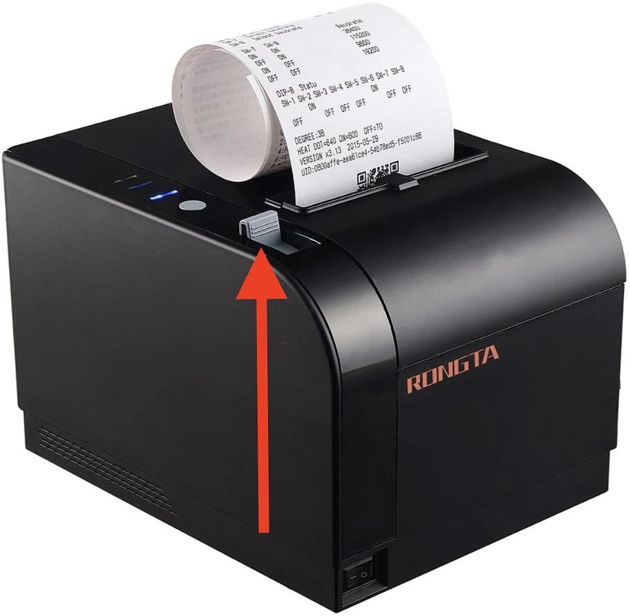 - On the top left of the receipt printer, pull the grey tab to open the paper roll compartment