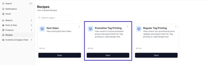 On the Recipes page, you will see a list of available recipes. Click Open on the Promotion Tag Printing recipe.