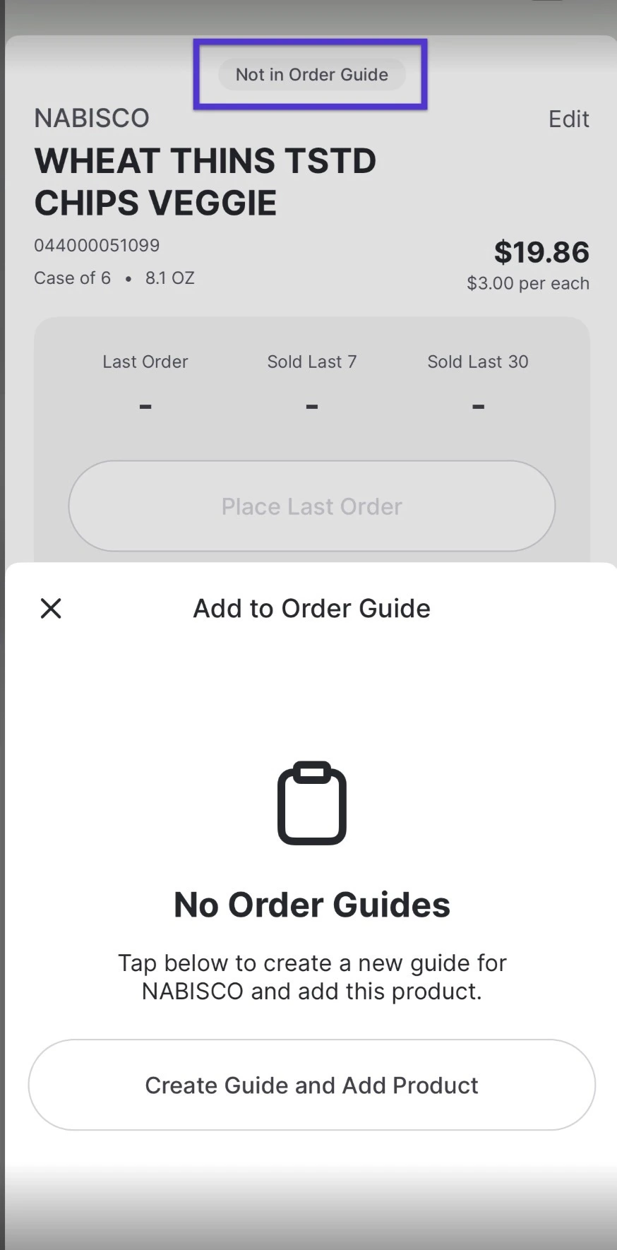 Add on the fly: When scanning or searching, tap Add to Order Guide to save an item for future use.