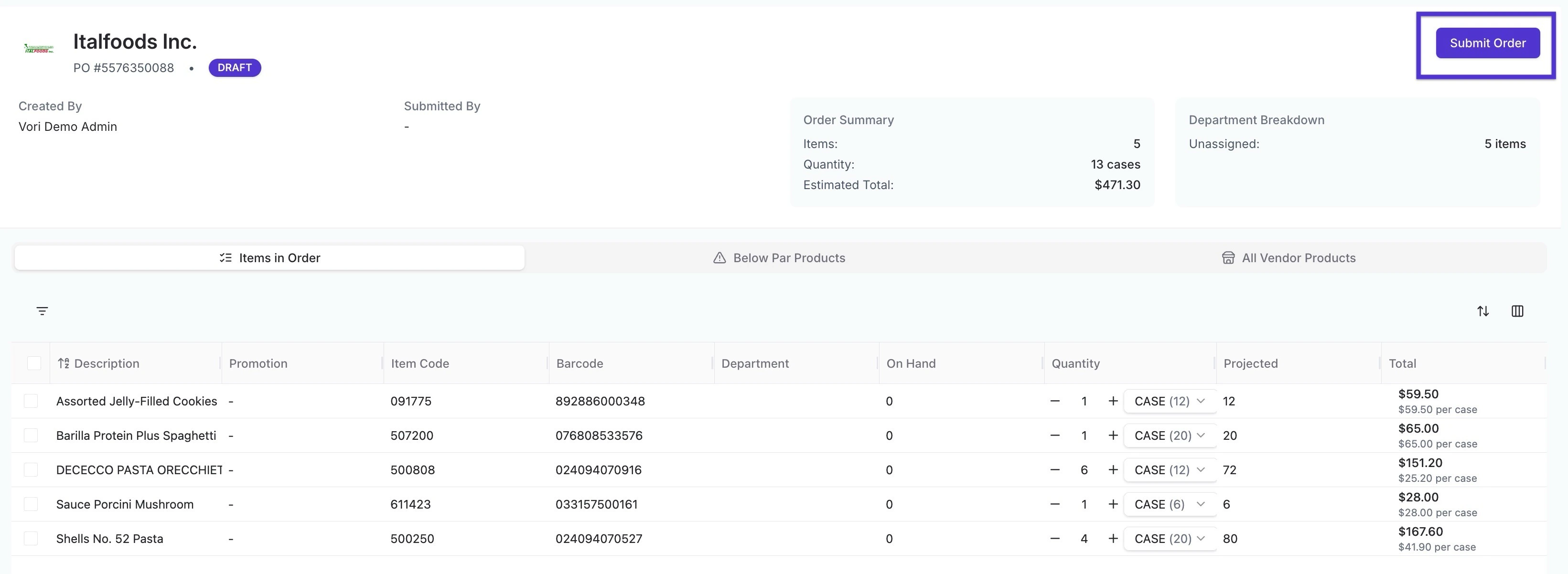 Review the items and quantities, then click the Submit button in the top right-hand corner.