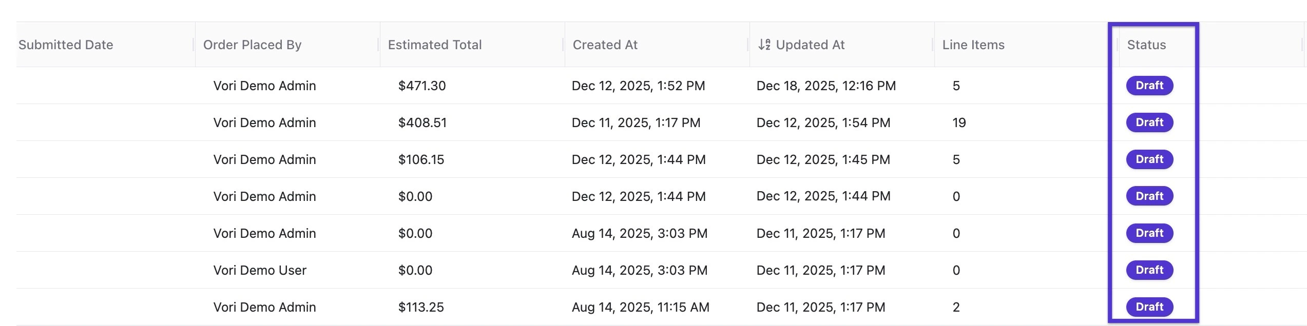 Find your order in the list. It should be labeled as Draft in the status column.