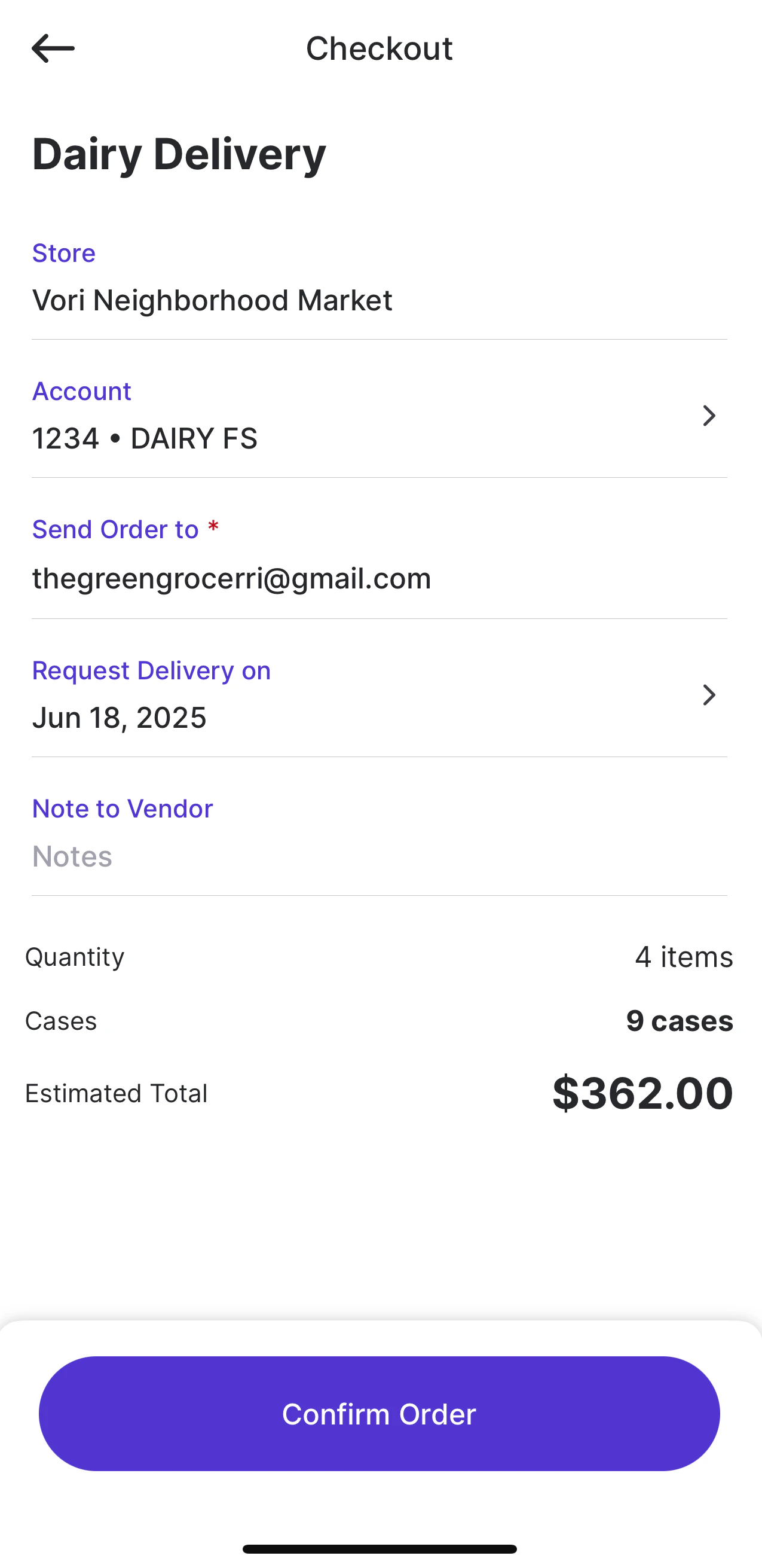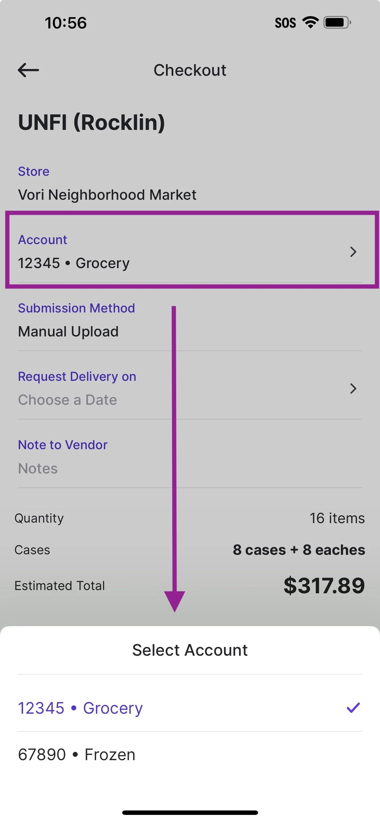 Use this field to select the correct vendor account number for this order. If your store uses different account numbers for specific departments (e.g., Produce, Grocery, Deli), choose the one that matches the products in your cart.