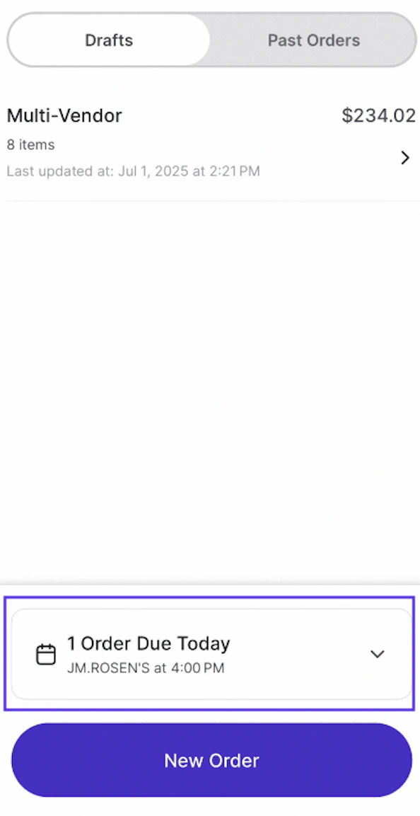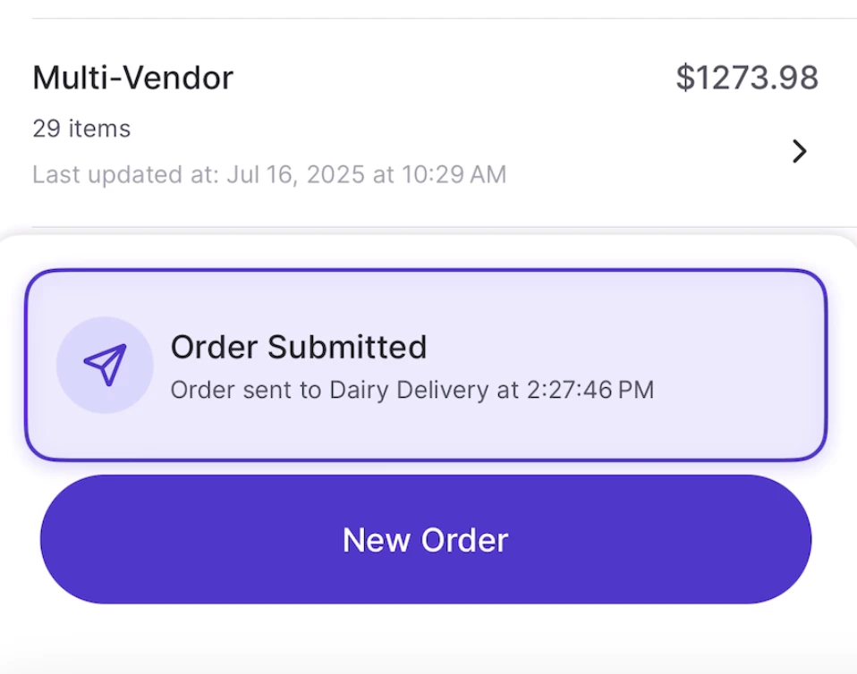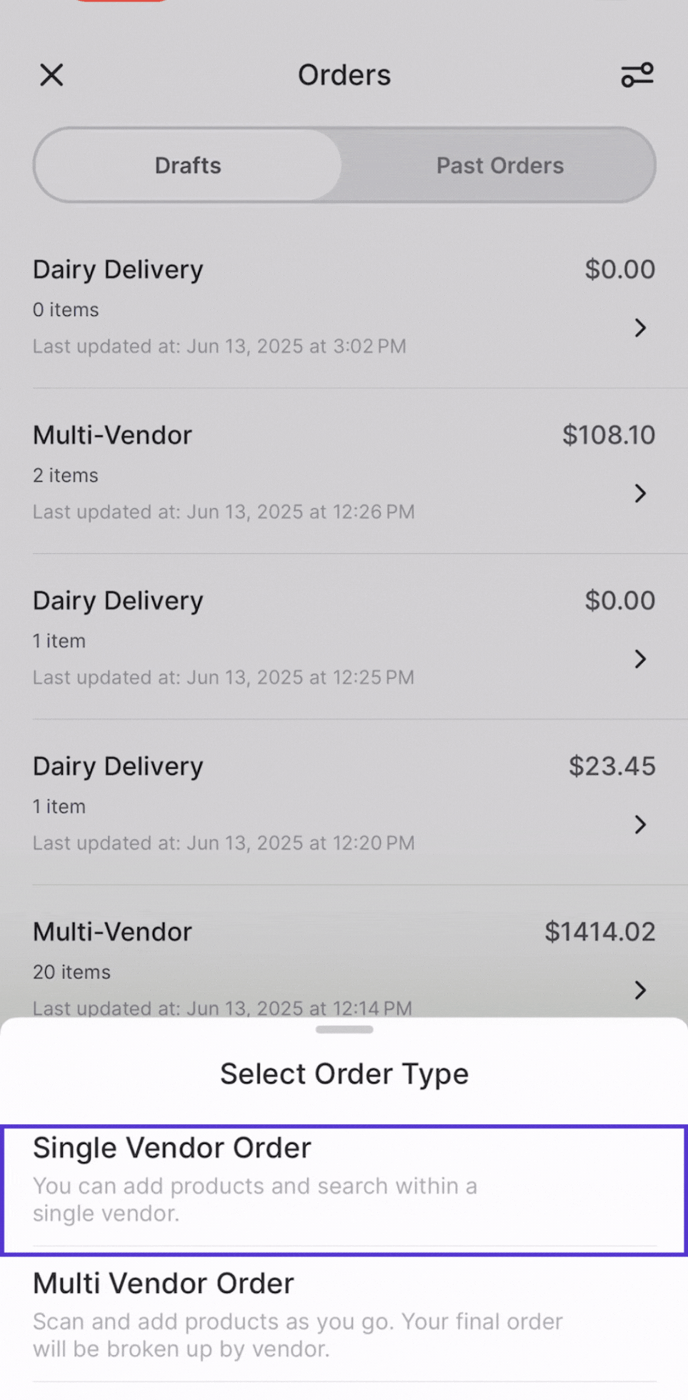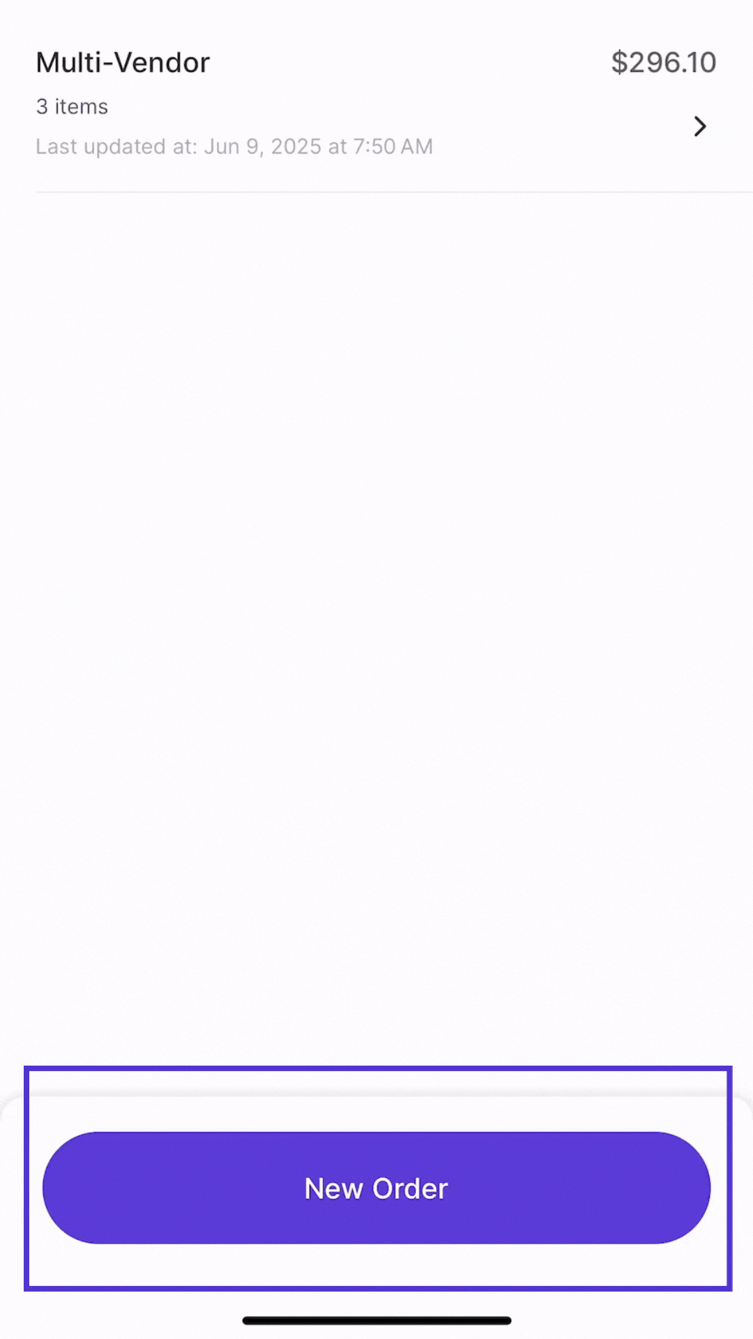 Ready to place an order? Tap New Order to get started. You’ll be prompted to choose:- Single Vendor Order: Order directly from one vendor.