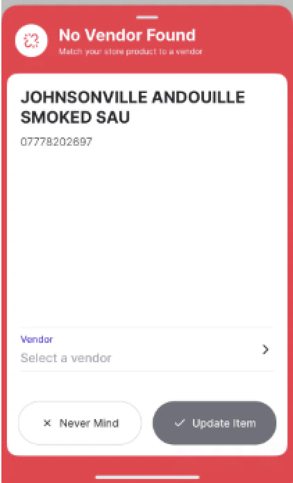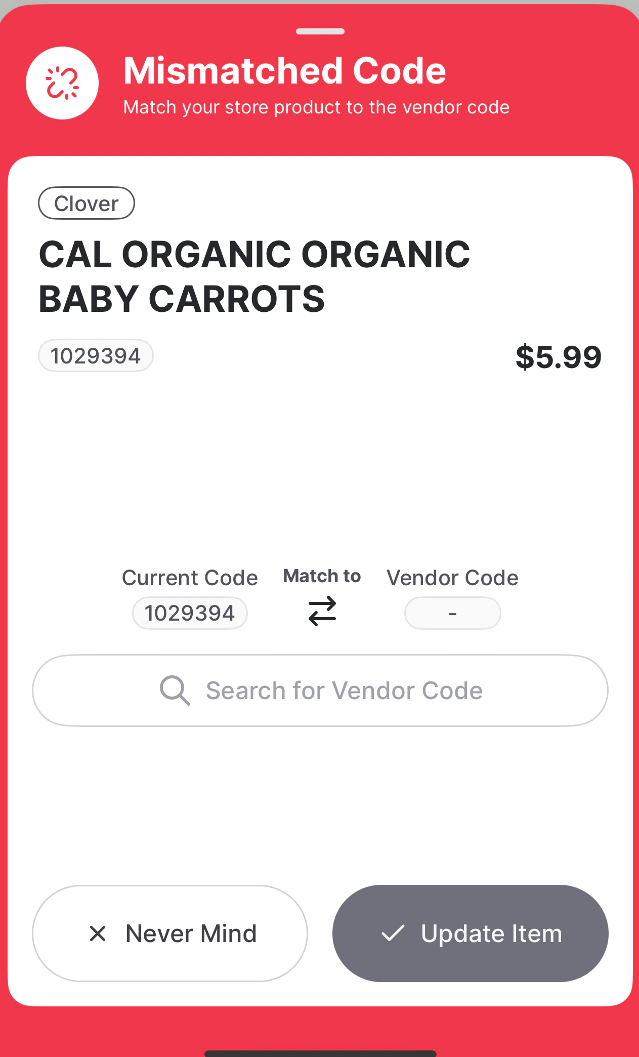 If the store product is not matched to the vendor code, you’ll see a Mismatched Code alert.