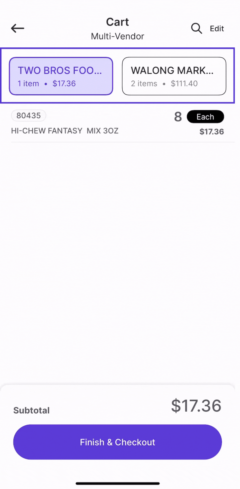 - Multi Vendor Order: Build a cart across multiple vendors by scanning or searching.