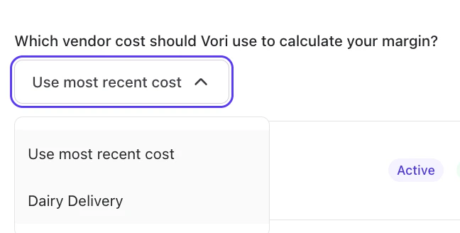 - Under Pricing, locate the field: “Which vendor cost should Vori use to calculate your margin?”