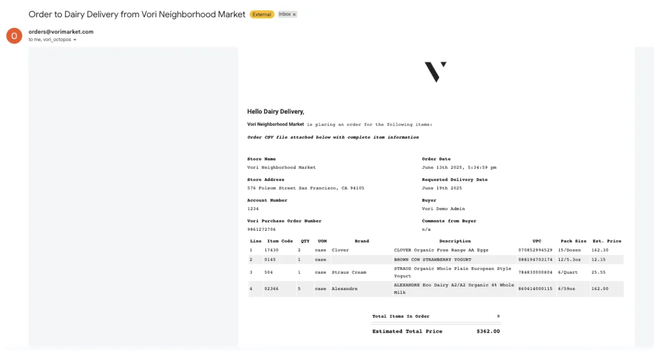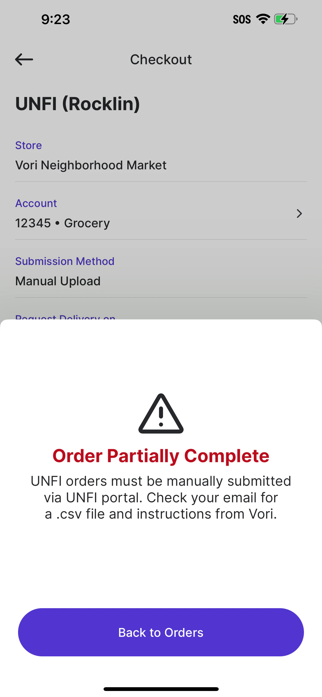 Some vendors, including UNFI and its subsidiaries (such as Tony’s and Supervalu), do not accept orders via email or direct EDI integration from Vori. Because of this, the Submission Method is automatically set to Manual Upload at checkout.- If the Submission Method is set to Manual Upload, check your email for the .csv file and follow the instructions provided by Vori.