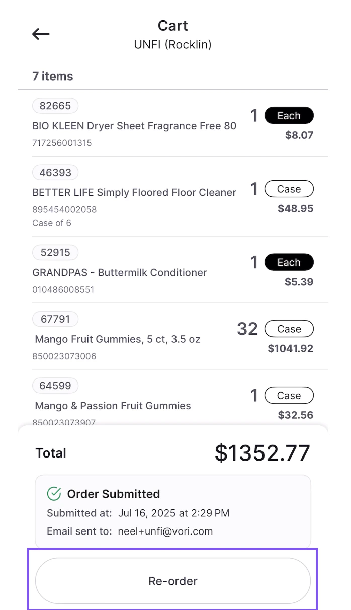 You can view and tap into Past Orders to review item details, track submission time, and see who received the confirmation email. To quickly reorder, select a past order and tap Re-order to add all items, along with their quantities, unit types, and vendor associations, into a new cart without starting from scratch.