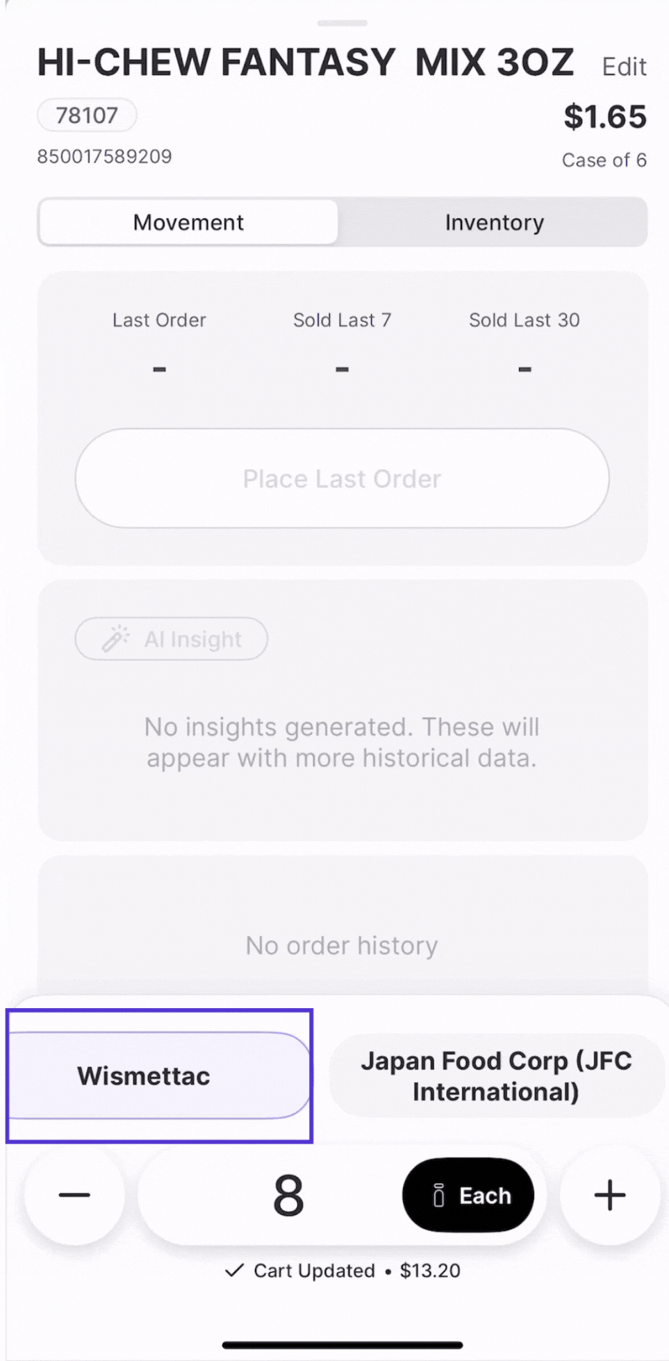 Once you select a product, the Product Order Details will appear with key details to help you make informed purchasing decisions.- Item Info: Brand, name, barcode.