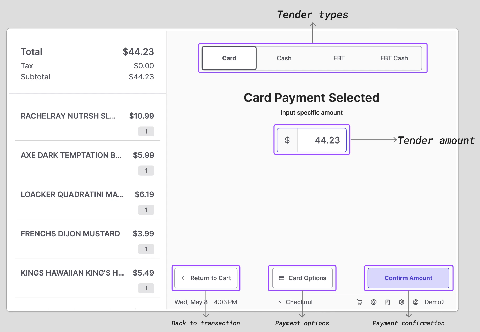 When a shopper pays with EBT, the POS automatically identifies eligible items and helps you split the payment.- After adding all items to the basket, select Complete Payment.