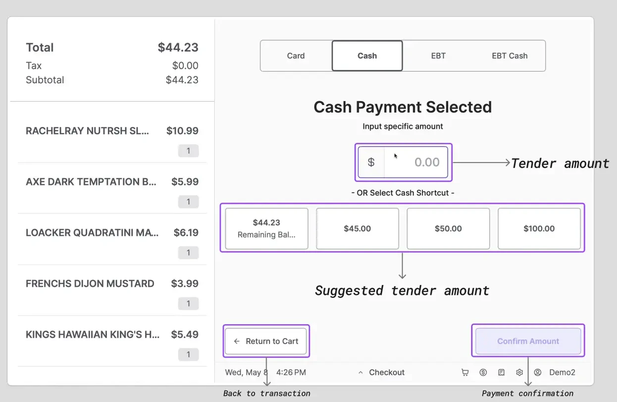 Click Confirm Amount to proceed with the EBT portion of the payment. The POS will prompt the shopper to swipe their card.