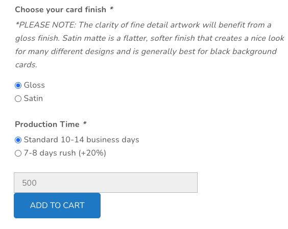 Choose card finish, production time and card quantity (the price per card will update based on quantity), then click