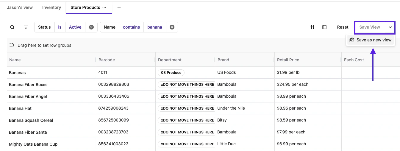 Save Views: Save, name, and delete views that are shared across all store logins, making it easy to access your most-used filters (e.g., “New Products”).