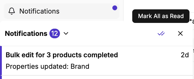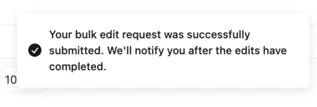 - Larger bulk edits (over 1,000 products) may take a few minutes to process. The success notification will arrive once the update has been fully completed for all selected items.