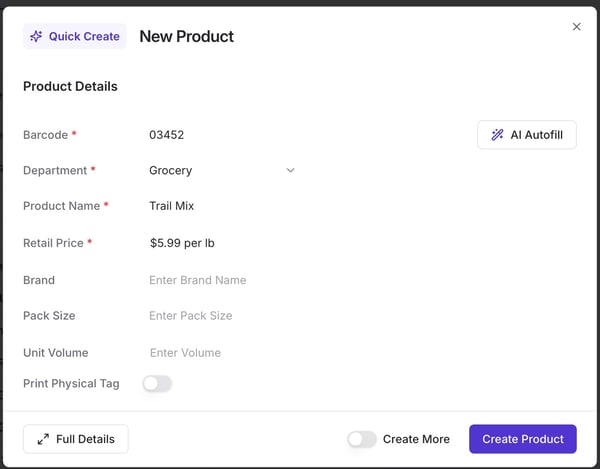 In the Barcode field, enter the 5-digit PLU (e.g., 03452)
