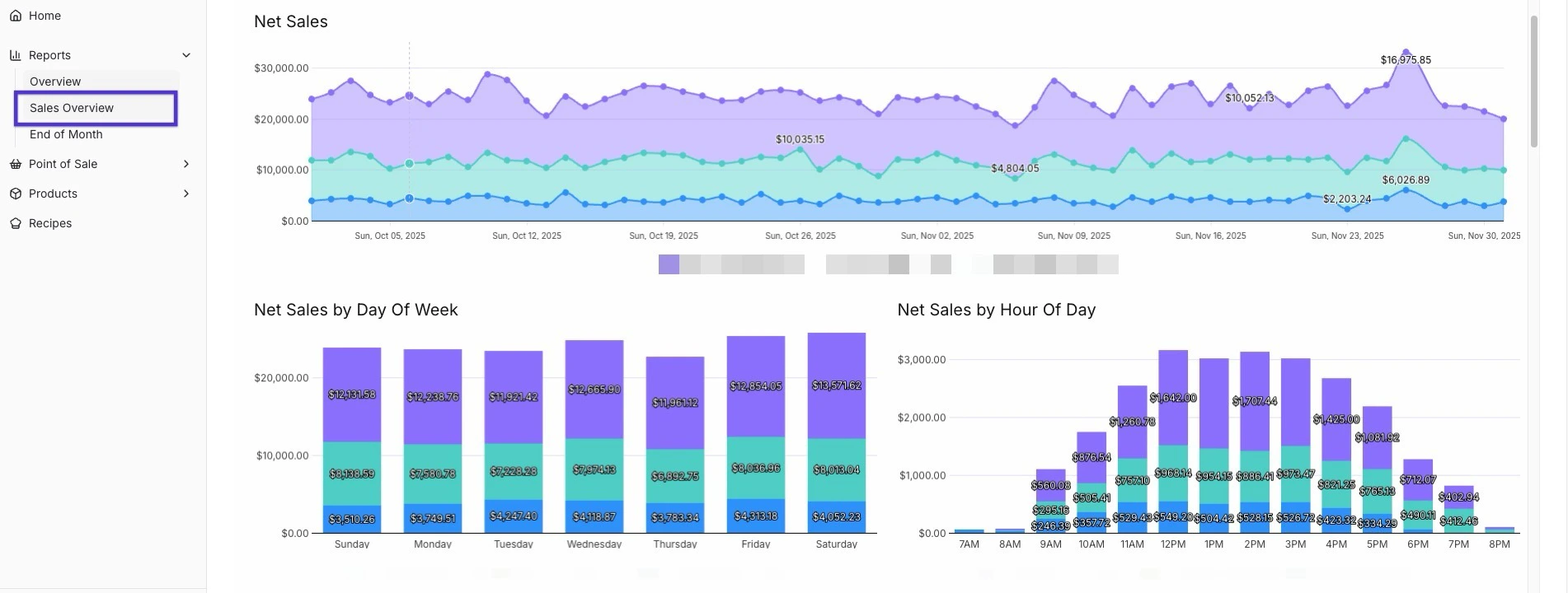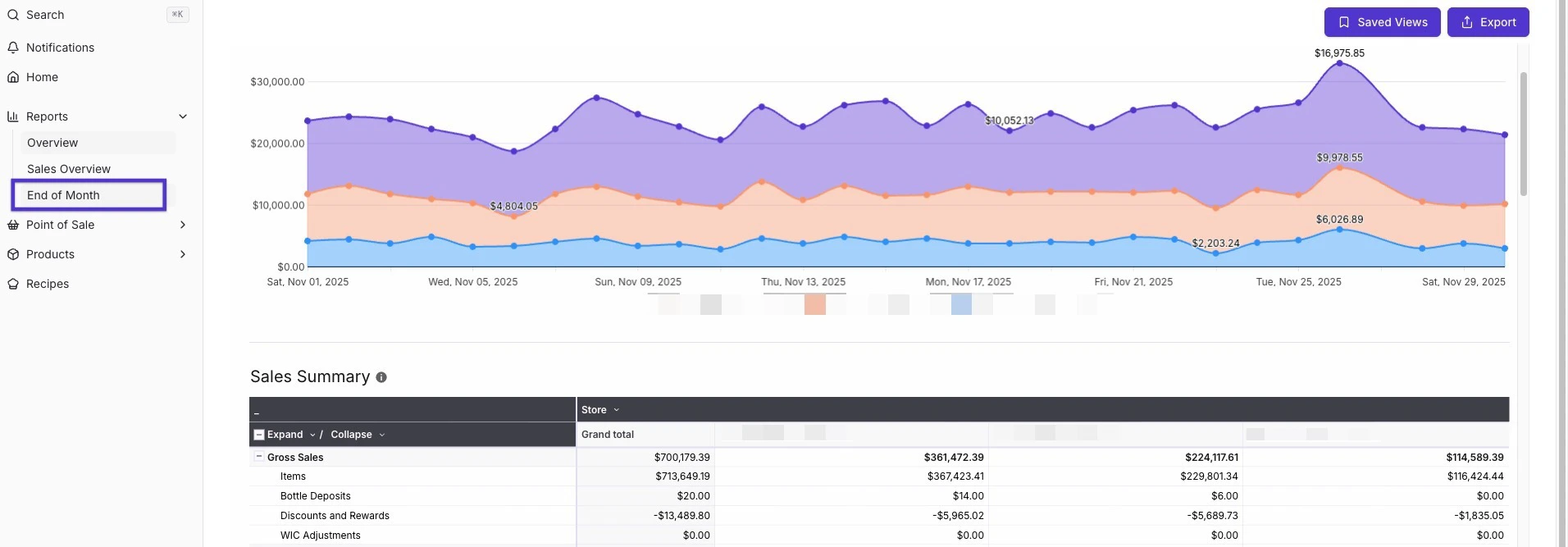 Most reports offer both combined summary data and store-specific detail views. Examples:- Item Sales Report: View all locations combined or filter by store.