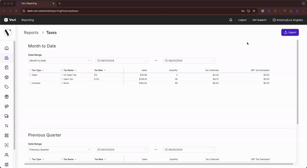 To access Tax reports, navigate to Reporting > Finances > Taxes.