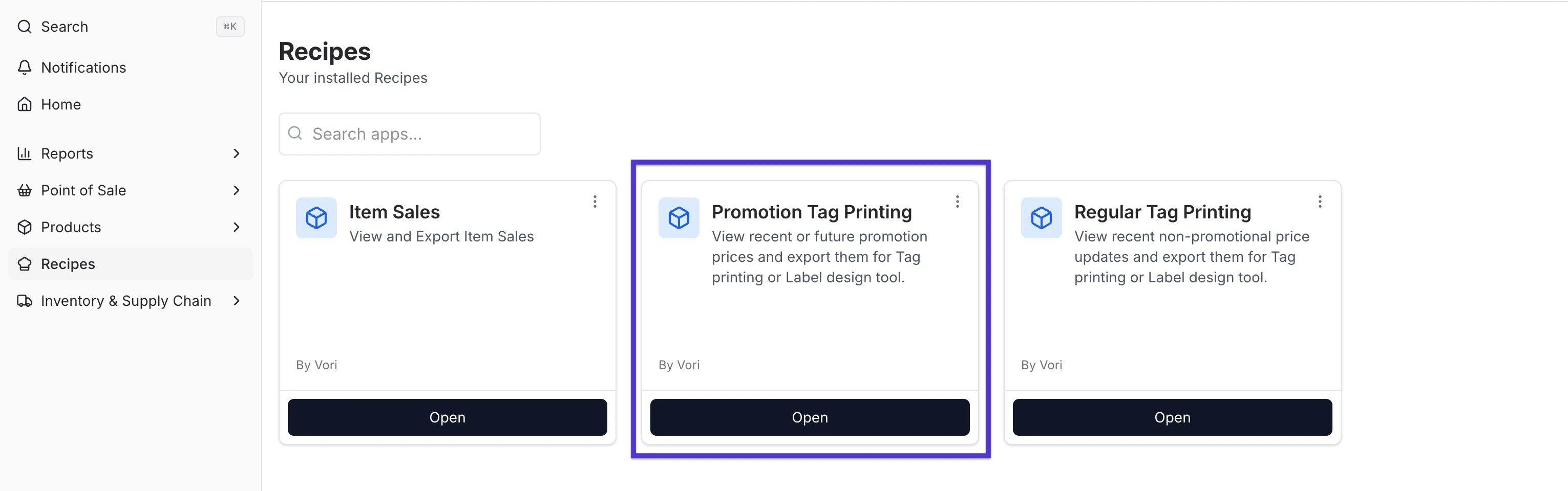 The Promotional Tag Printing recipe is a pre-built tool in Vori that allows you to generate a CSV file containing all the necessary data fields for your promotional tags. This feature is ideal for stores that use external software (like Bartender or RTI signs) to design and print their price tags. Instead of manually inputting data or using a standard import template, you can customize the output to match the exact fields required by your tag-making program.Step 1: Access the Recipe