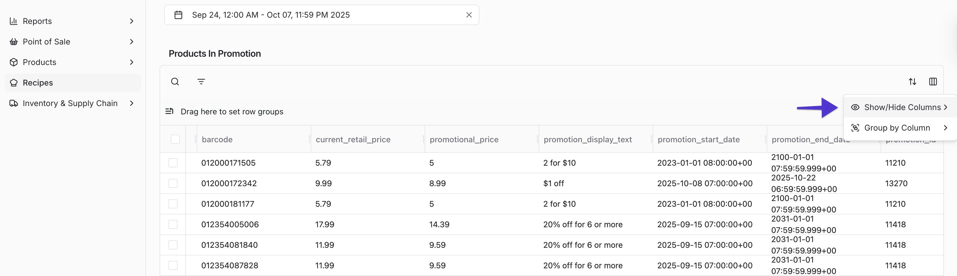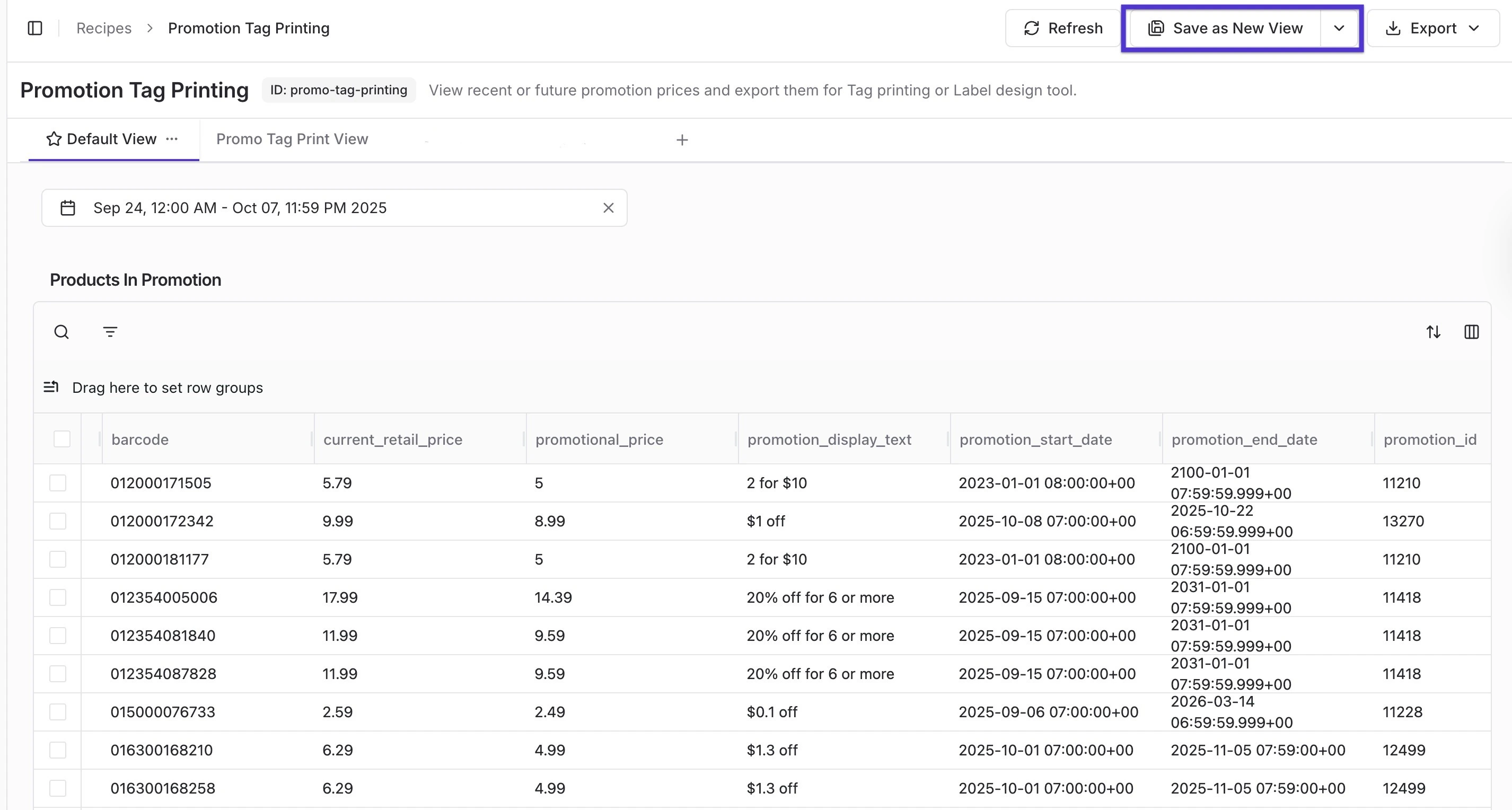 The recipe displays a table view of your current, active promotions. You need to adjust this table’s columns to ensure the exported data format is compatible with your external tag-making software.- Set the Date Range. At the top of the table, check the date range to ensure it covers all the promotions for which you need to print tags. You can adjust the start and end dates as necessary.